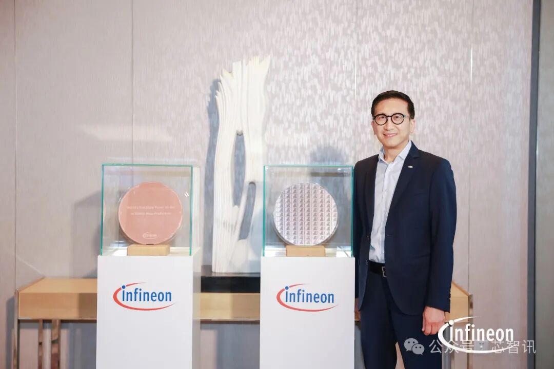 △英飞凌科技全球高级副总裁及大中华区总裁、英飞凌科技消费、计算与通讯业务大中华区负责人潘大伟展示300mm(12英寸)氮化镓功率半导体晶圆和20μm超薄硅功率晶圆