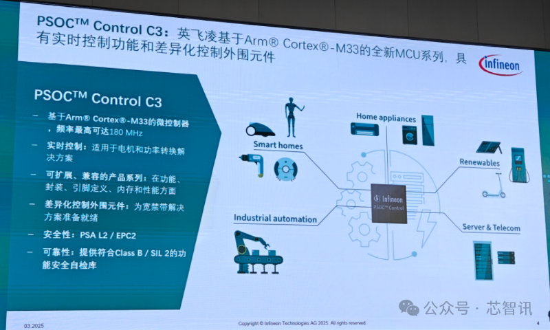 在此次 “2025 英飞凌消费、计算与通讯创新大会”上,英飞凌还推出了全新的PSOC™ Control C3 MCU,可以实现电机和功率转换系统的实时控制。
