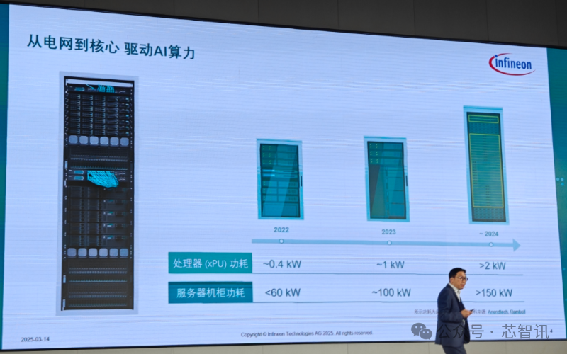 “从传统服务器到AI服务器,英飞凌能够提供丰富的半导体解决方案,满足多样化的需求。以单个AI服务器机架为例,功率半导体的价值可高达15,000美元,而普通服务器机架中的功率半导体价值通常约为100美元左右。这种显著的价值差异,正是AI算力需求激增所带来的对于更高效的功率半导体需求的体现。英飞凌的高效、高密度功率半导体产品,能够完美契合这一趋势,为AI基础设施提供可靠的电力支持。正是这种技术与市场的深度契合,推动了我们在这一领域的业务持续快速增长。”潘大伟解释道。