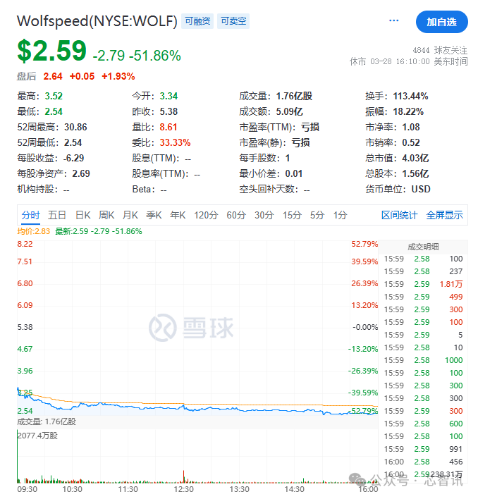 3月31日消息,美国碳化硅衬底及器件大厂Wolfspeed因受到公司可能无法与债权人达成债务交换协议、以及美国“芯片法案”补贴案前景不明的冲击,当地时间周五(3月28日)股价暴跌51.86%,收于2.59美元/股,创1997年4月22日以来收盘新低。