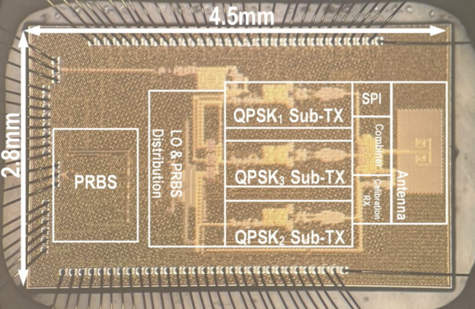 其中,无线发射器(TX)是完全集成在45纳米CMOS SOI中,能够实现超过100 Gb/s的数据速率。在射频域内直接形成64QAM星座的独特方法,使用三个QPSK子TX并控制振幅加权,有效缓解了功率放大器(PA)非线性在高阶调制中带来的复杂性。这一战略性方法为带宽和输出功率的显著提升打开了新途径。论文还进一步探讨了该TX设计的额外优势,如局部振荡器(LO)泄漏抑制和提升输出功率,同时详细介绍了电路块实现的具体情况。RF-64QAM TX原型采用40 GHz射频带宽,测量数据传输速率为120 Gb/s,有效各向同性辐射功率(EIRP)为16 dBm。