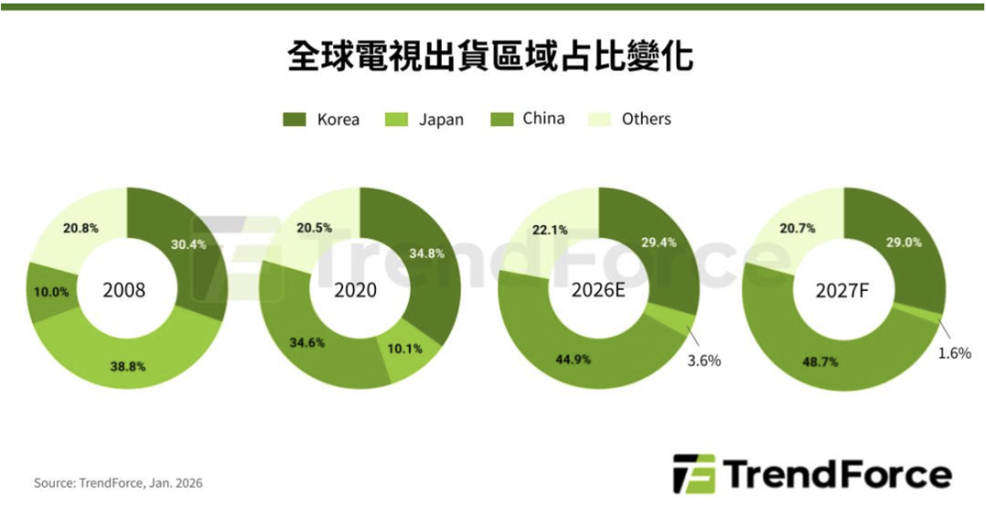 回顾过去,日系品牌曾掌握近40%全球电视市占率,但中国品牌快速崛起与价格竞争下,东芝、Funai、Panasonic先后转为授权或出售电视事业。TCL与Sony合资公司待监管单位核准后,预定2027年4月启动,中国品牌的全球电视市占率,预估将向五成推进,市场主导权转移趋势更明确。