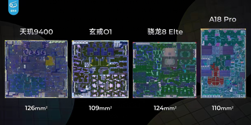 △玄戒O1与其他旗舰手机SoC的芯片内部结构图对比