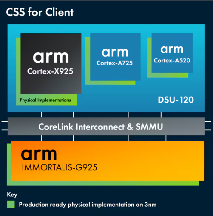 总结来说就是,Arm CSS for Client是一个整合了Arm最新的X925超大核、X725大核、A520能效核和G925 GPU核心及互联多核解决方案包,并且该解决方案是经过各晶圆厂3nm制程优化验证的,可以直接提供硬核交付。
