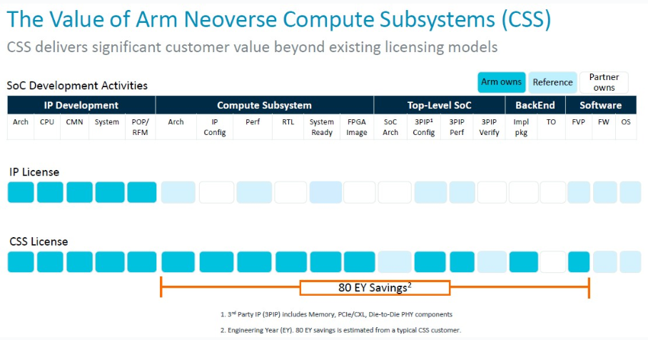 根据Jeff Defilippi当时的说法,客户通过使用Arm提供的CSS包来进行芯片开发,与使用普通 IP 许可证来进行开发相比,可以节省80个工程师一年时间的开发。而且保留了相当的自由度。(应该是指也可以软核交付,客户可以进一步开发和优化设计)