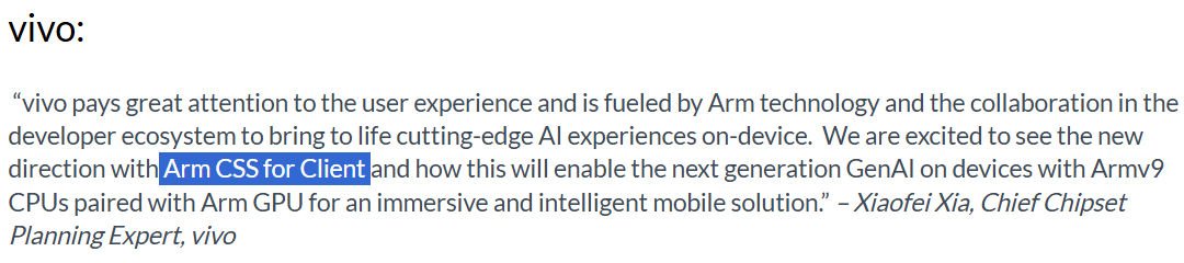 同时,vivo首席芯片规划专家夏晓菲也表示:“vivo 非常注重用户体验,在 Arm CSS 的技术基础之上,我们与 Arm 的密切合作,共同推动开发者生态,使手机更流畅更好用,同时也为设备端带来了前沿的 AI 体验。……”