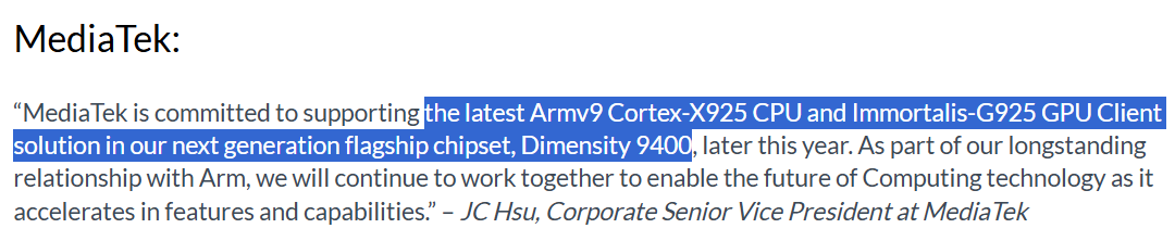 值得一提的是,Arm在2024年宣布推出Arm CSS for Client的新闻稿中,联发科技资深副总经理、无线通信事业部总经理徐敬全博士当时就表示,“天玑 9400将搭载最新的Armv9 Cortex-X925 CPU 和 Arm Immortalis-G925 GPU客户端解决方案。我们与 Arm 保持着长期而紧密的合作关系,致力于不断提升移动芯片的性能和功能,共同推动计算技术的快速发展。”