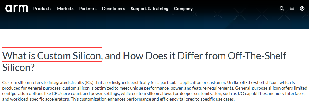 这一点Arm在其官网上其实就有介绍。“Custom Silicon”是指:“专为特定应用或用户设计的集成电路 (ASIC)。与为现成通用目的而生产的传统芯片不同,Custom Silicon 经过优化,可满足独特的性能、功耗和功能要求。通用芯片提供的配置选项有限,例如 CPU 核心数量和功耗设置,而“Custom Silicon”则允许更深入的定制,例如 I/O 功能、内存接口和特定工作负载的加速器。这种定制可以根据特定用例提升性能和效率。”