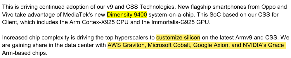 而且,Arm还指出,“芯片复杂性的增加正在推动顶级超大规模制造商在最新的Armv9和CSS上‘Custom Silicon’(面向自己的用户需求自定义芯片)。我们正在通过AWS Graviton、微软Cobalt、谷歌Axion和英伟达基于基Arm技术的Grace芯片在数据中心获得份额。”
