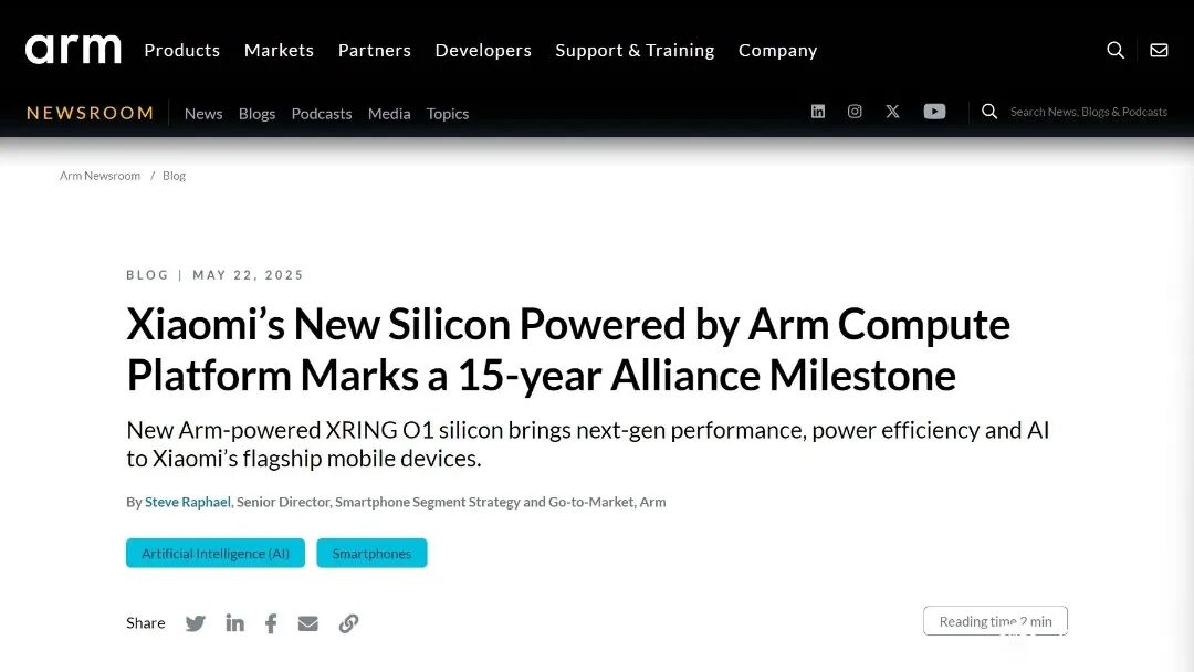 起因是,Arm官网近日发布了一篇题为《XRING O1 Custom Silicon from Xiaomi is Powered by the Arm Compute Platform》的新闻稿(已删除),常规翻译过来的意思就是“小米的XRING O1定制芯片由Arm计算平台提供支持”,并称这“标志着小米与Arm合作15年,小米的第一个定制芯片为下一代设备带来了先进的AI和性能提升。”