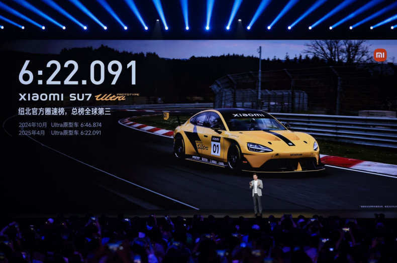 在发布会上,雷军还宣布了又一项属于中国汽车的全新纪录:小米SU7 Ultra原型车再次征战纽北,获得了6分22秒091的成绩,比去年大幅提升了24秒,不仅再次刷新纽北赛道原型车圈速成绩,并且进入了纽北圈速总榜全球第三。目前纽北圈速总榜前两名分别是保时捷919 Hybrid EVO和大众ID.R,均为两门定制赛车。