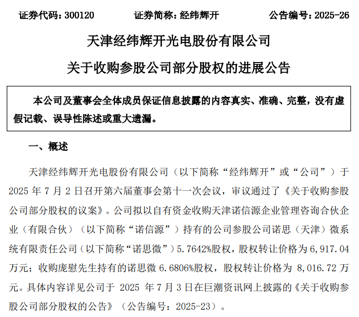 7月2日晚间,经纬辉开(300120.SZ)公告称,公司拟收购天津诺信源企业管理咨询合伙企业(有限合伙)持有的公司参股公司诺思(天津)微系统有限责任公司(以下简称“诺思微”)5.76%股权,交易价格6917.04万元;收购庞慰持有的诺思微6.68%股权,交易价格8016.72万元。此次合计收购诺思微12.44%股权。