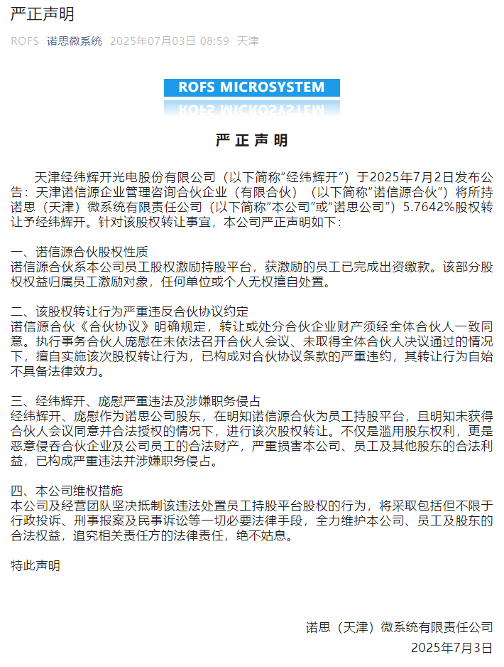 诺思微发“严正声明”,称该交易“严重违法并涉嫌职务侵占”面对经纬辉开的收购,7月3日,诺思微发布严正声明,指控经纬辉开“严重违反合伙协议约定”,及“涉嫌违法及职务侵占”。