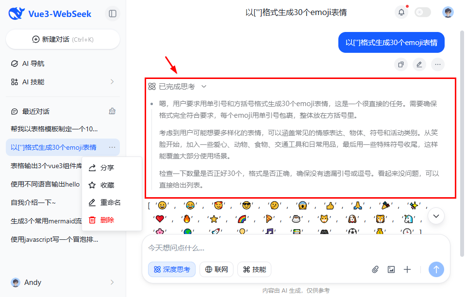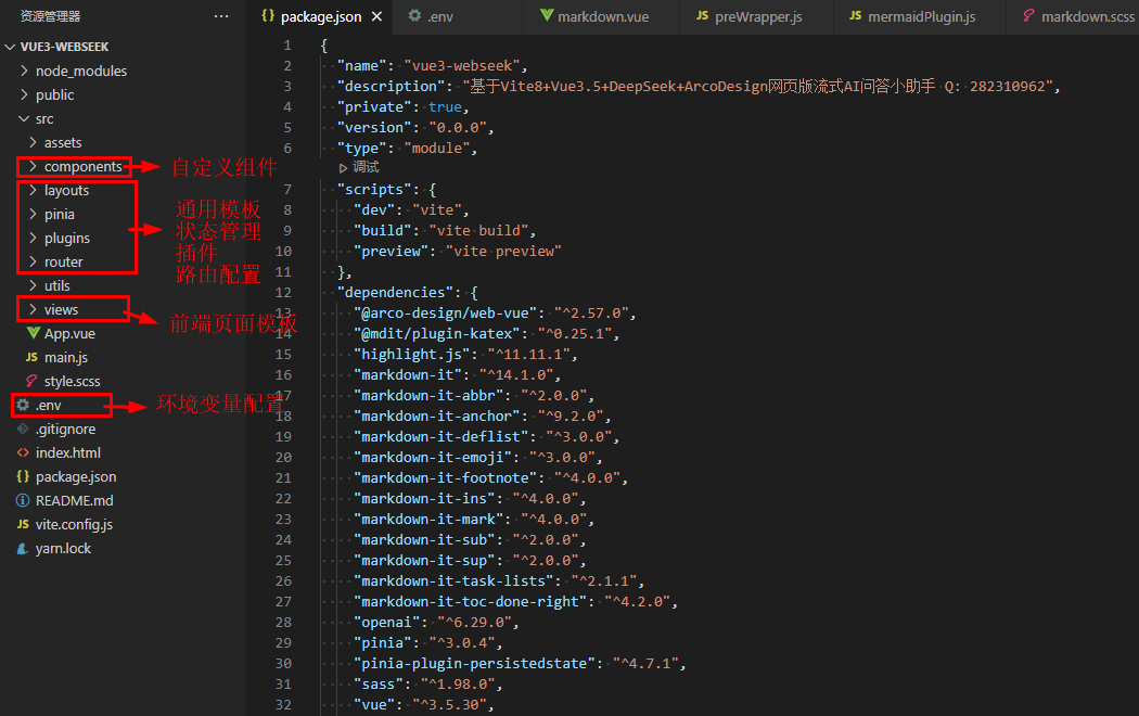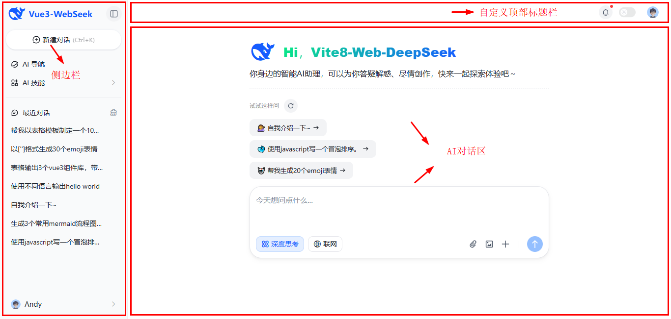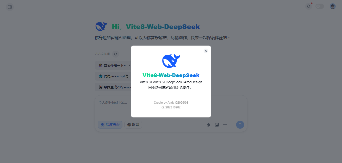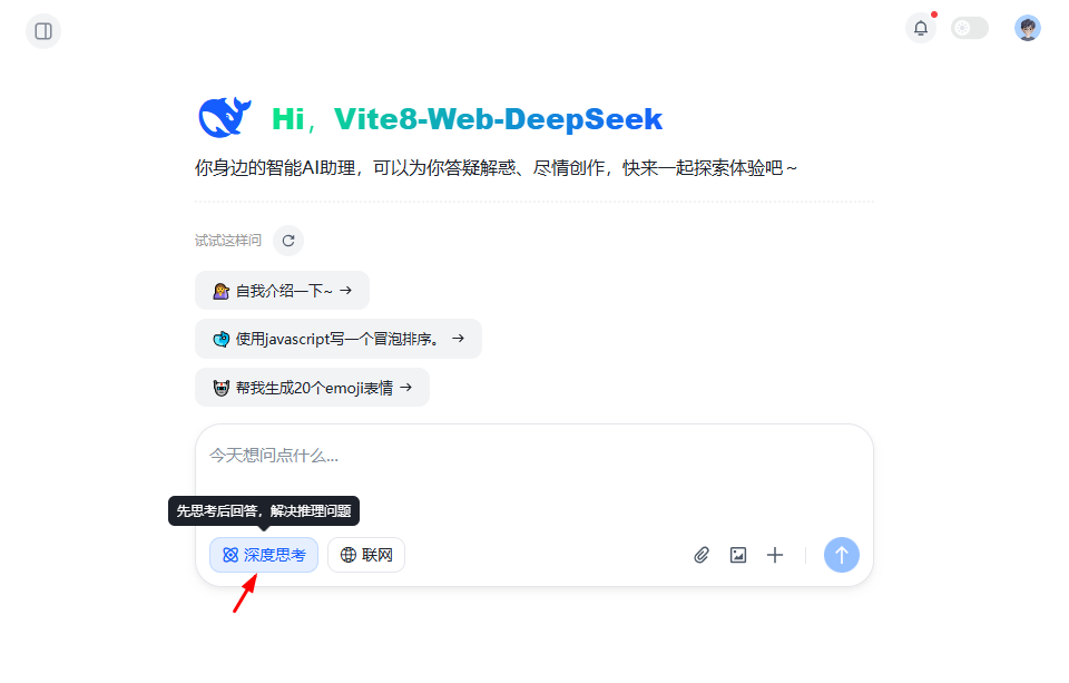 使用最新vite8.0创建项目,接入deepseek api智能模型,vue3 setup语法糖开发页面。