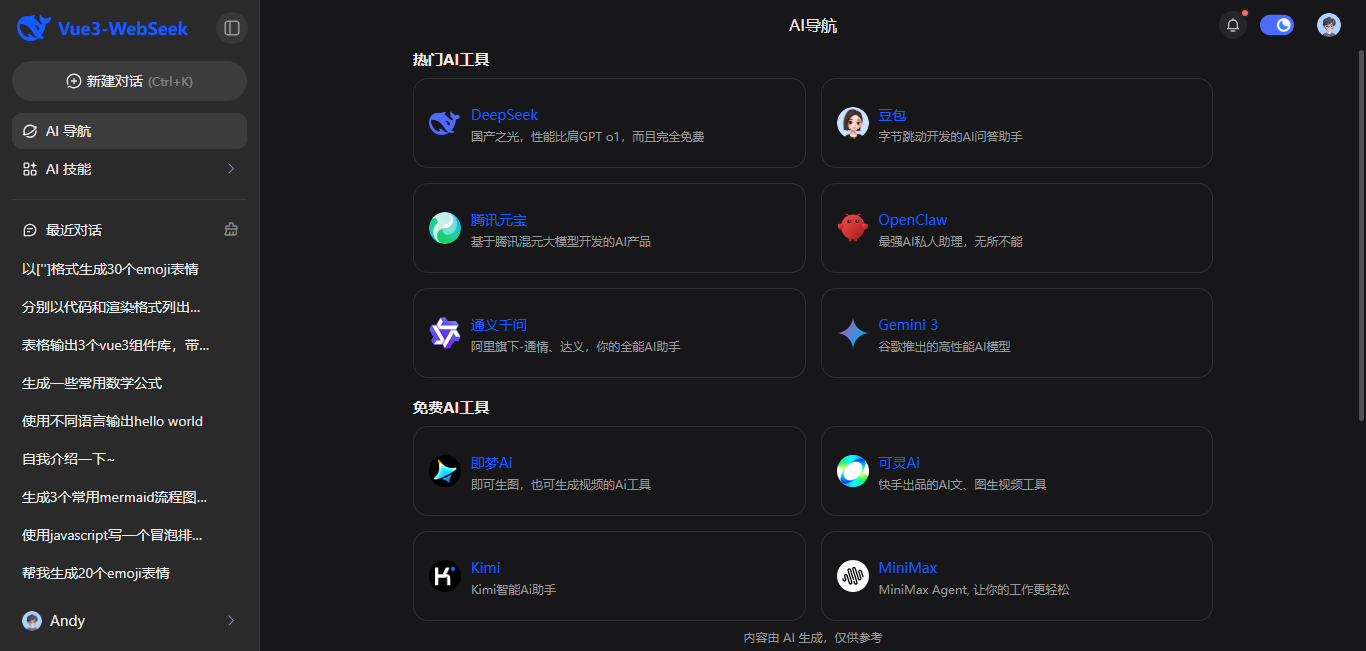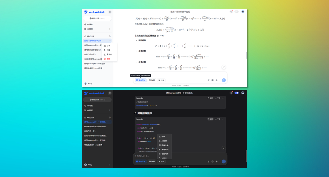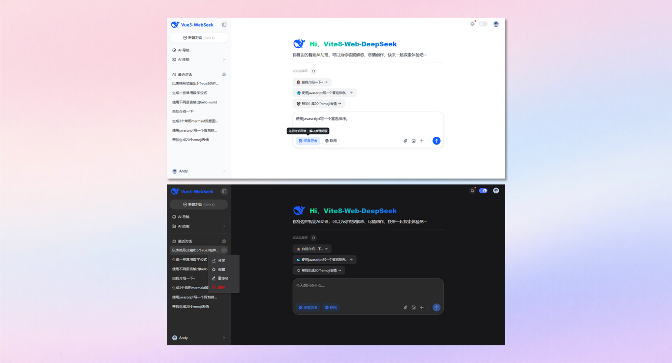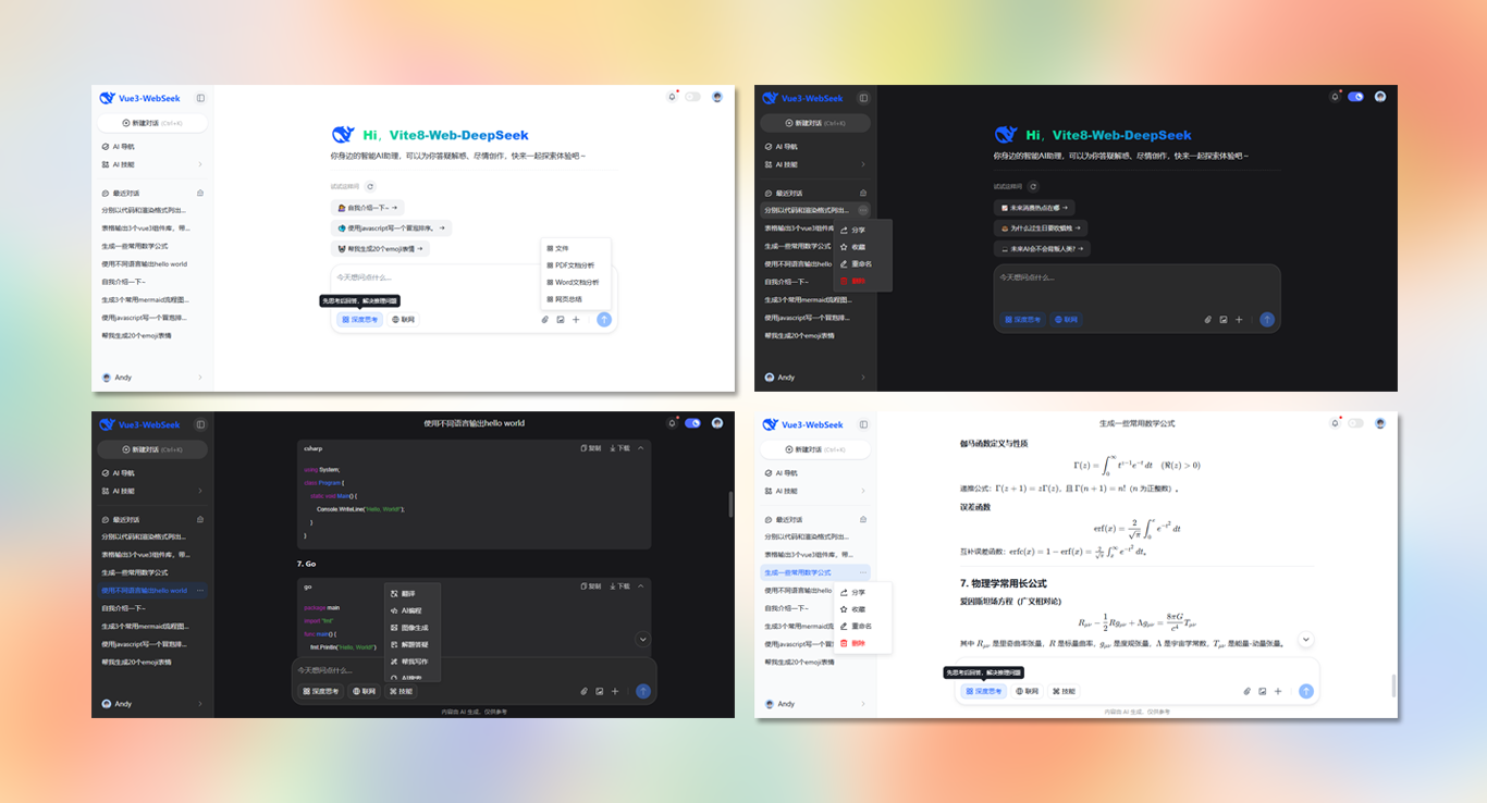 vite8-deepseek-webai提供暗黑+亮色主题、支持流式打字输出、深度思考、代码高亮/复制/下载、渲染katex公式/mermaid图等功能。