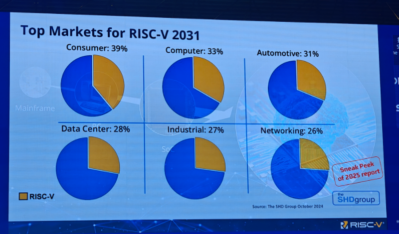 目前,RISC-V已经开始从嵌入式的计算拓展到更广泛的应用,包括存储技术和HPC等等,所以将会拥抱更加广泛的应用范围。根据SHD研究所的研究数据显示,预计2031年,RISC-V的出货量将会超过200亿颗。届时,RISC-V在消费类产品、计算机、汽车等多个领域将会有更大的占比。因为有这样一个非常灵活、创新的模型,我们也在从通用目的的片上系统向更多的工作负载的场景进行前进。