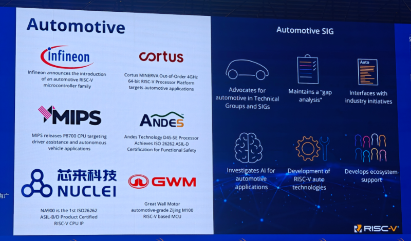 比如在汽车行业当中,RISC-V有广泛的应用,英飞凌去年3月公布了一个基于RISC-V的微控制器,还有中国的芯来科技也有NA900,这是第一个基于ISO26262 ASIL-B/D认证的RISC-V CPU IP。RISC-V国际基金会也成立了汽车领域的特别兴趣小组。