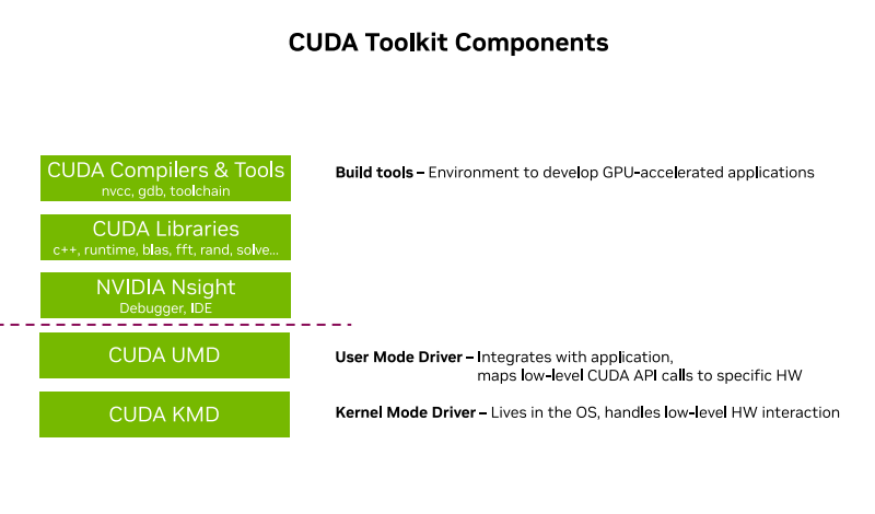 据介绍,CUDA主要包含两个关键组成部分:一个Toolkit,一个是驱动器。CUDA的Toolkit像是一个编译器一样,拥有非常好的编译功能,其中也包括了非常多的组件。