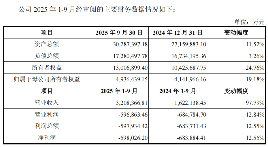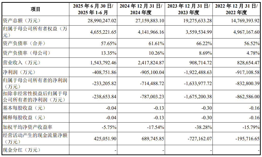 报告期各期,归属于母公司所有者的净利润分别为-83.28亿元、-163.40亿元、-71.45亿元和-23.32亿元;截至2025年6月30日,公司累计亏损为-408.57亿元,公司尚未盈利且存在累计未弥补亏损。