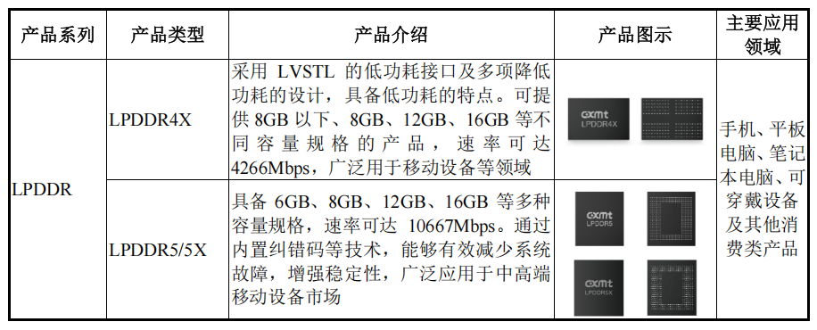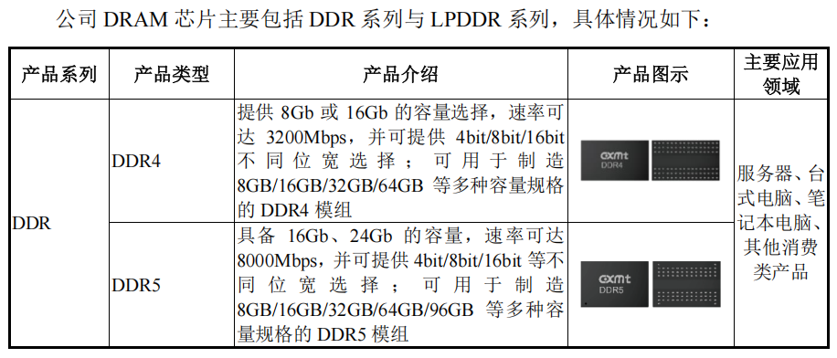 长鑫科技主要提供DRAM 晶圆、DRAM 芯片、DRAM 模组等多元化产品方案,产品主要覆盖DDR、LPDDR两大主流系列,目前已完成从DDR4、LPDDR4X到DDR5、LPDDR5/5X的产品覆盖和迭代,产品广泛应用于服务器、移动设备、个人电脑、智能汽车等市场领域。