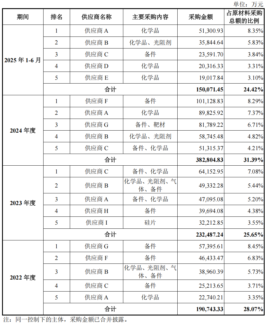 报告期内,长鑫科技生产经营使用的主要原材料包括化学品、备件、光阻剂、硅片、气体和靶材。长鑫科技向前五大原材料供应商采购金额占当期原材料采购总额的比例分别为28.07%、25.65%、31.39%和24.42%。显然,长鑫科技对于前五大供应商的依赖程度较低。