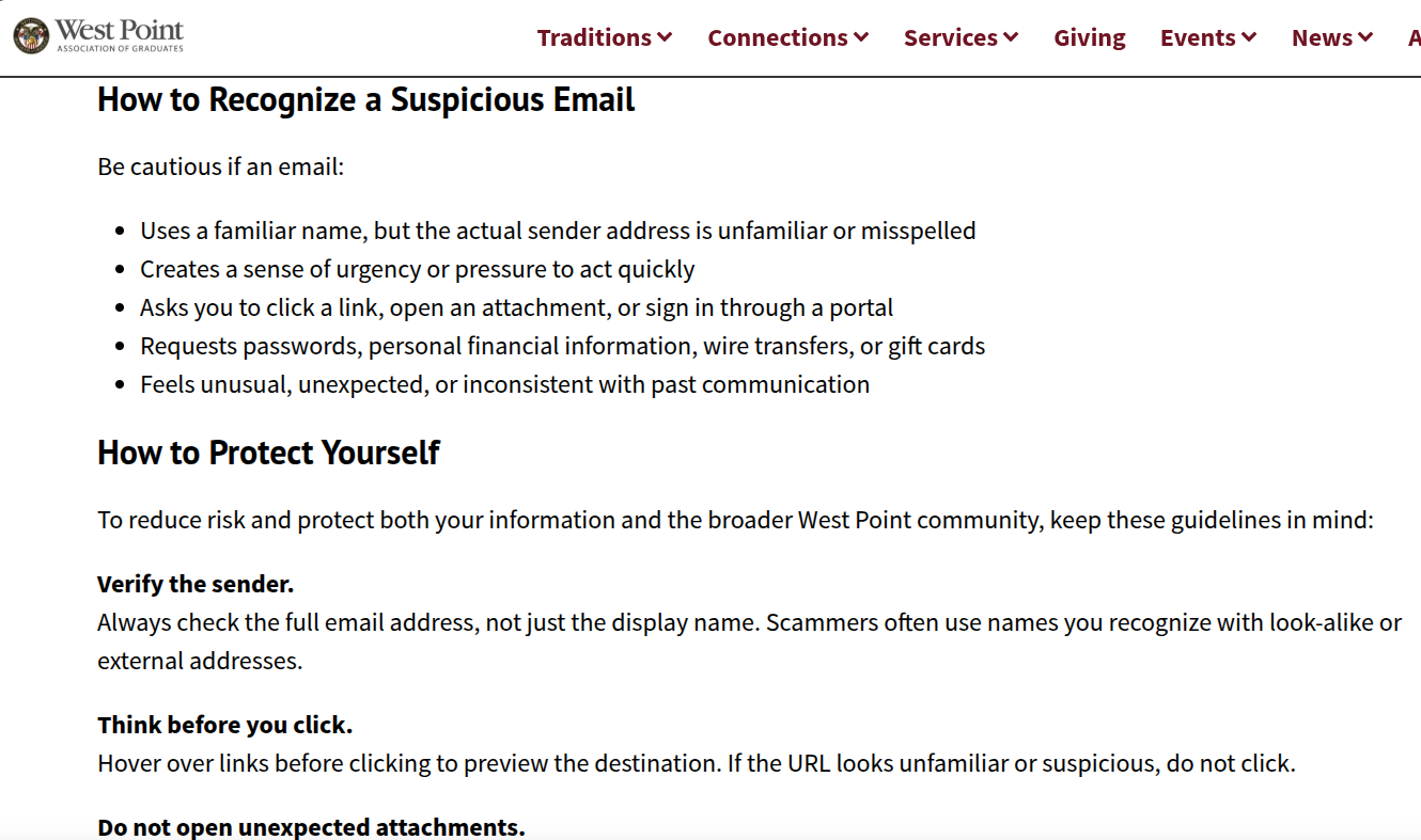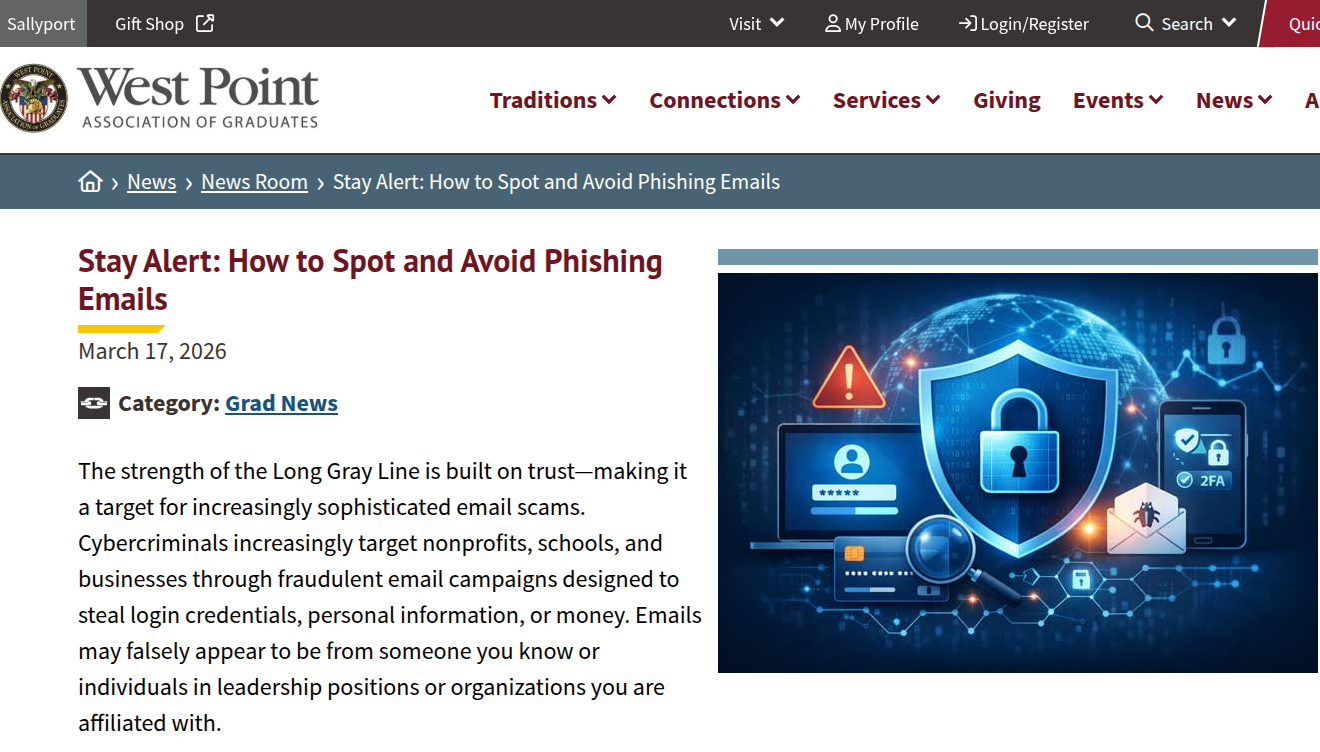 近期,西点军校校友会(West Point AOG)发布了一篇题为《保持警惕:如何识别和避免网络钓鱼邮件》的深度指南,明确指出“长灰线”(Long Gray Line,指西点军校校友群体)的力量建立在信任之上,而这恰恰使其成为日益复杂的电子邮件诈骗的首选目标。该报道深刻揭示了当前钓鱼攻击的一个显著趋势:针对非营利组织、学校及企业的定向欺诈活动激增,攻击者往往冒充领导者或关联组织成员,利用“显示名称欺骗”技术,使邮件在视觉上高度可信,实则源自外部恶意源。报道强调,由于此类邮件源自组织外部,纯粹的技术控制手段存在局限性,因此“意识提升”与“仔细审查”构成了最佳防御屏障。