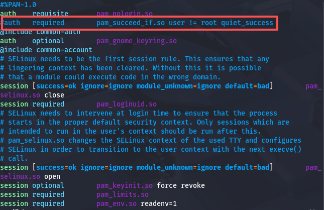 auth required pam_succeed_if.so user != root quiet_success
