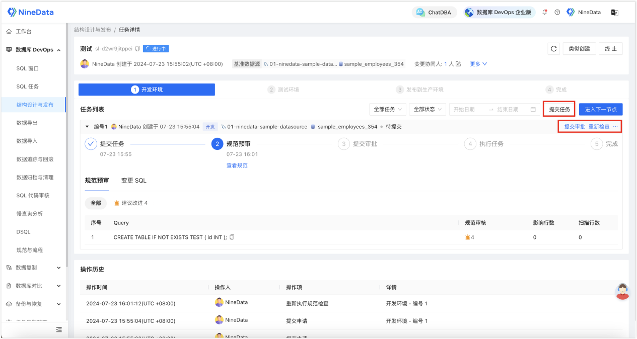 单击创建结构设计与发布后,即可开启流程。在每个环境内部,开发人员(变更协同人)可以提交多个变更任务,并且根据审批流程配置,每个任务都将经过系统的规范检查以及人员审批。