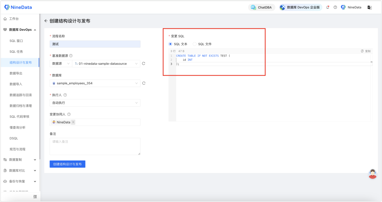在变更 SQL 文本框中输入需要发布的变更语句。