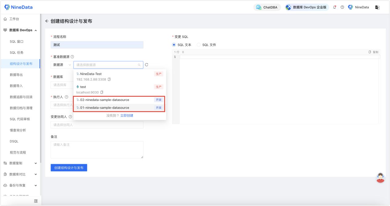 但如果把视角收窄到“开发、测试、预发、生产的多环境结构发布”,脚本工具仍然会留下一个空档:它们更强于‘怎样执行脚本’,不一定更强于‘怎样组织整个多环境发版流程’。NineData 的‘结构设计与发布’则是直接从这个空档切入——它不是先假设你已经有一套完整的流程,而是把流程节点、节点约束、审批与执行关系都内建进平台。