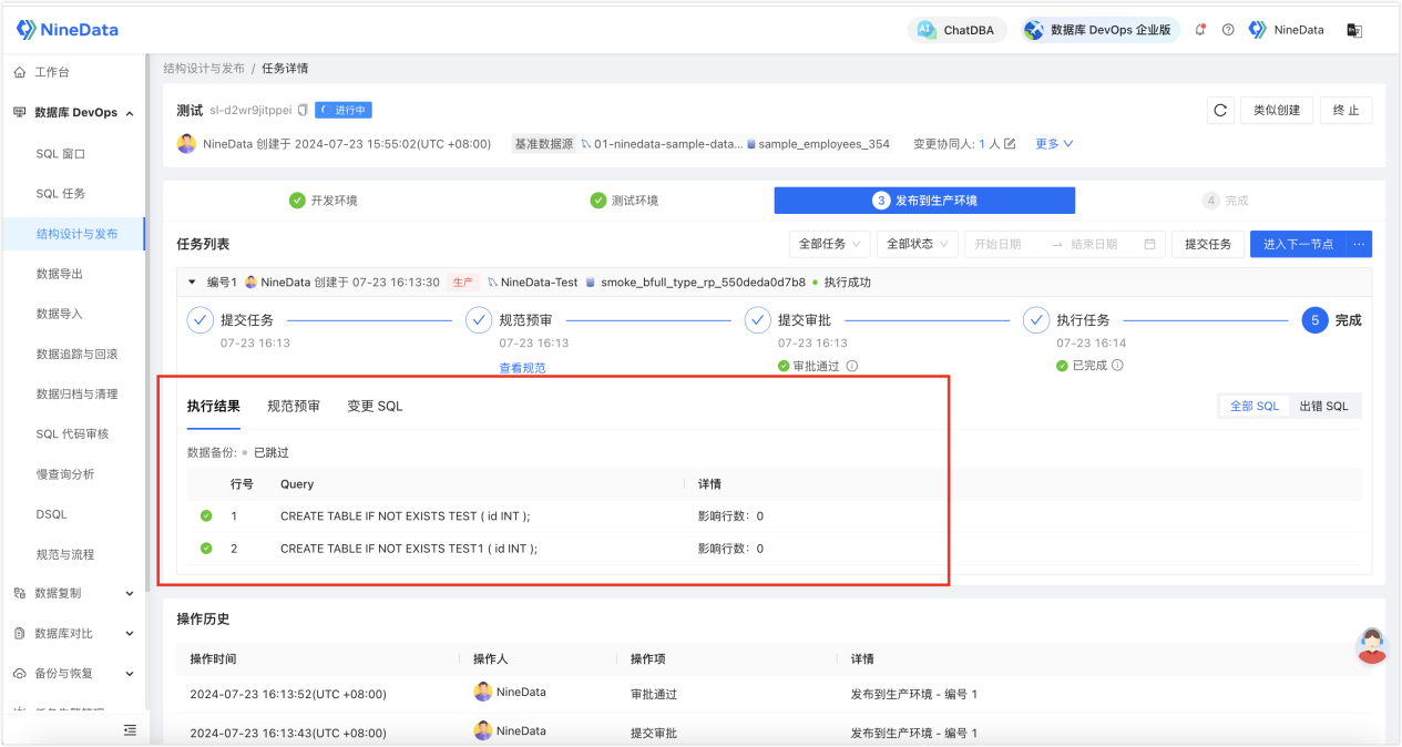 在执行结果中,可以看到变更已经顺利发布到生产环境,再次单击进入下一节点,流程结束。