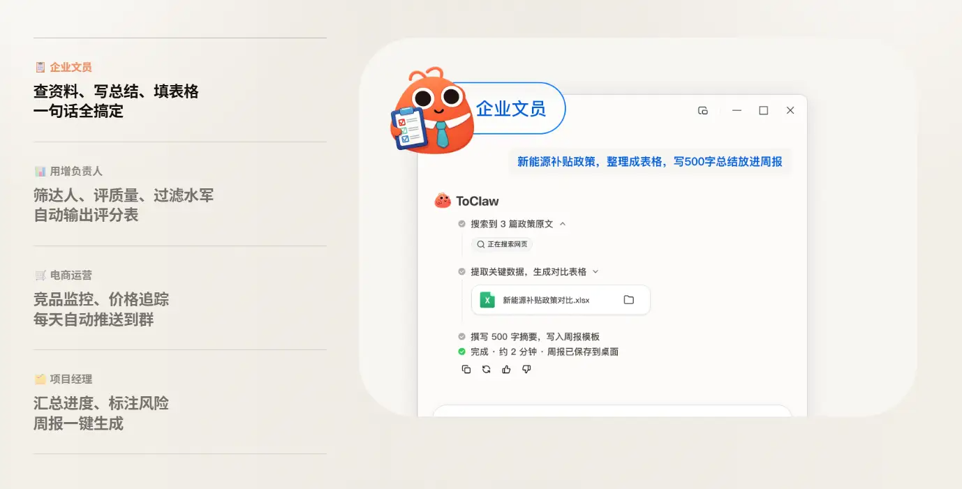 ToClaw遵循“动脑在云端,动手必请示”。涉及文件移动、删除或系统关键设置,必须经过你的手动确认,绝不越权操作。