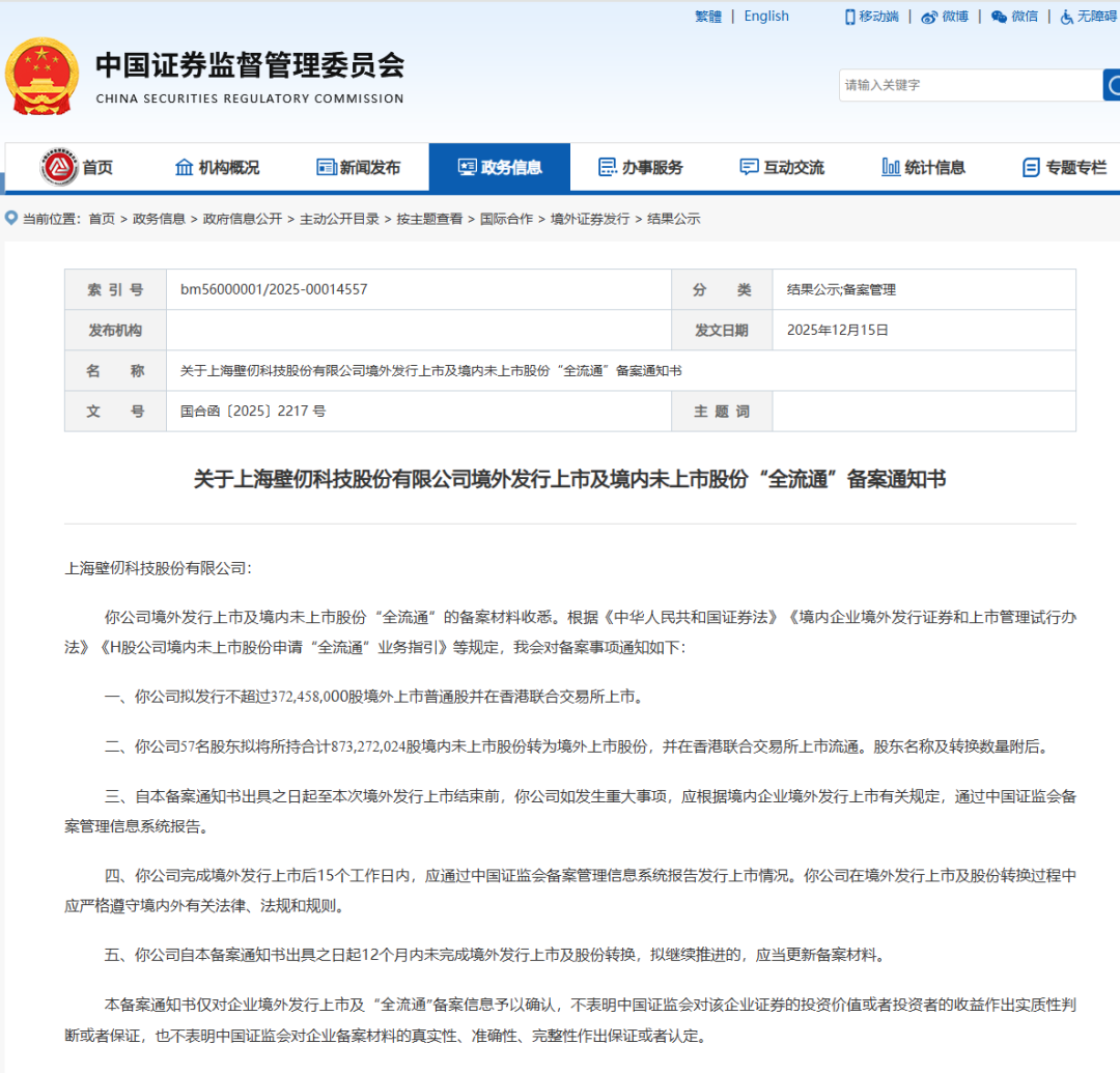 12月15日消息,中国证监会国际合作司发布了关于上海壁仞科技股份有限公司(以下简称“壁仞科技”)境外发行上市及境内未上市股份“全流通”备案通知书。
