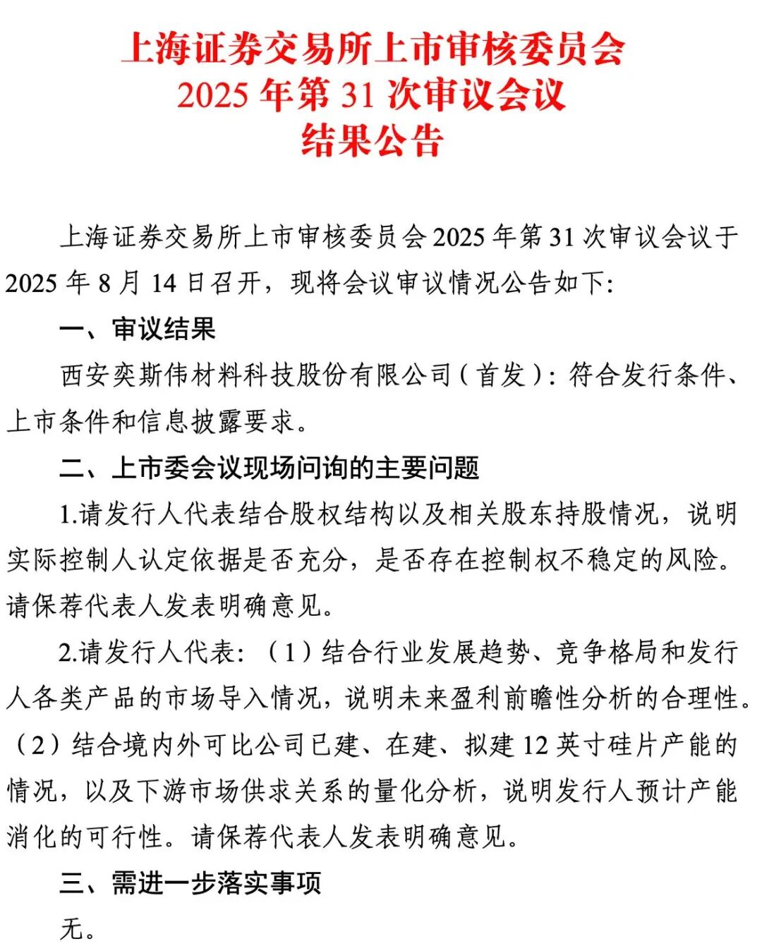 8月14日晚间,根据上海证券交易所官网信息显示,西安奕斯伟材料科技股份有限公司(以下简称"西安奕材")科创板IPO申请成功获得通过。