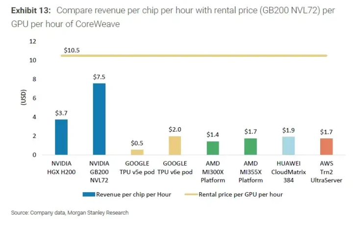 根据摩根士丹利的计算,对于给定的100MW规模的AI工厂,尤其对于专注于推理的AI工厂来说,英伟达的GB200 NVL72系统目前在盈利能力方面居于市场领先地位,其次是谷歌的TPU v6e pod。