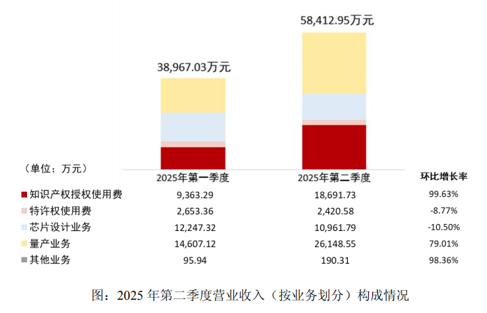 2025 年第二季度,芯原股份实现营业收入 5.84 亿元,环比增长 49.90%,主要由知识产权授权使用费收入及量产业务收入增长所带动。具体而言,公司 2025 年第二季度实现知识产权授权使用费收入 1.87 亿元,环比增长 99.63%,同比增长 16.97%;2025 年第二季度实现量产业务收入2.61亿元,环比增长 79.01%,同比增长 11.65%。