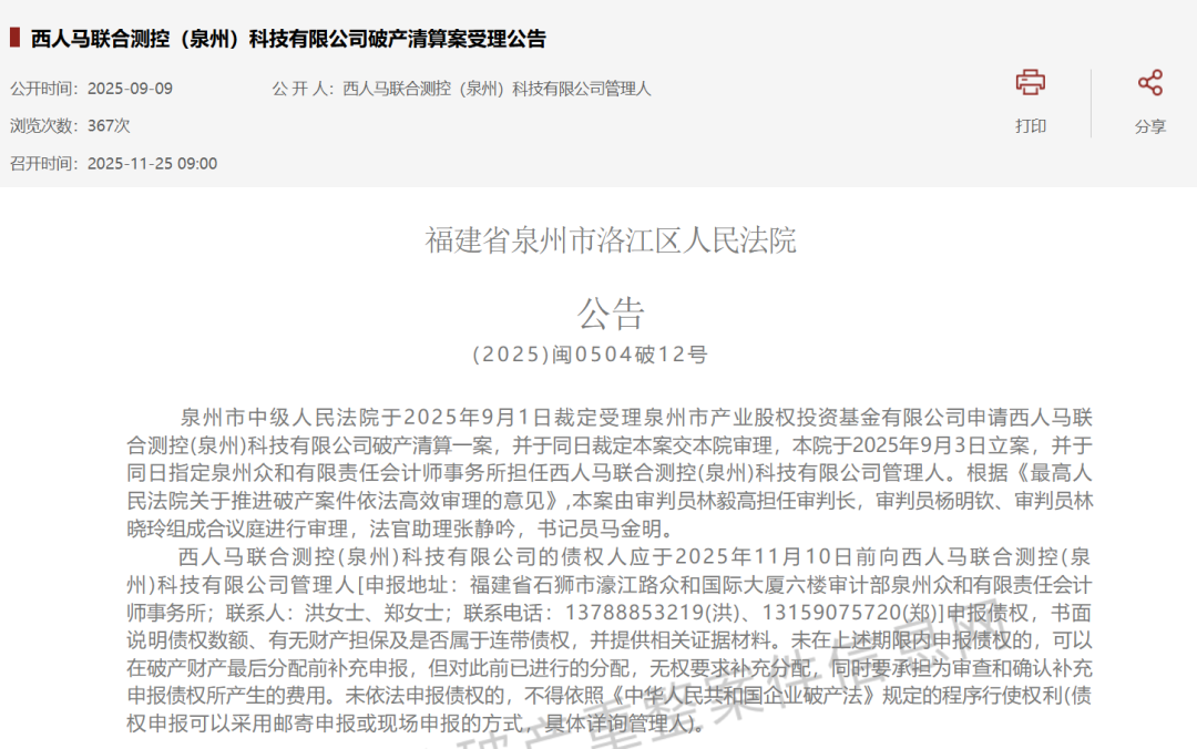 9月17日消息,根据全国企业破产重整案件信息网最新公布的信息显示,9月9日,泉州市中级人民法院已裁定受理西人马联合测控(泉州)科技有限公司(以下简称“西人马”)破产清算一案。