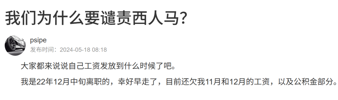 然而,讽刺的是,在2024年5月之时,还有西人马的前员工在网络上控诉西人马拖欠其2022年数月的工资。显然,西人马真实情况并不像其所说的那样“转危为安”,其资金链一直都十分的紧张。