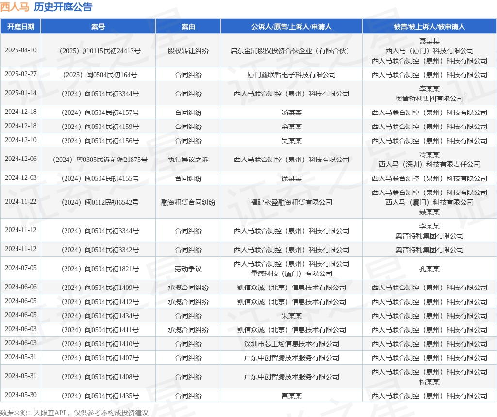 另据证券之星今年2月的报道,根其统计,截至今年2月的近一年内以西人马联合测控(泉州)科技有限公司为当事人的历史开庭公告有38则,其中案由为“合同纠纷”的公告以21则居首,其次为“劳动争议”有5则,“承揽合同纠纷”有4则。