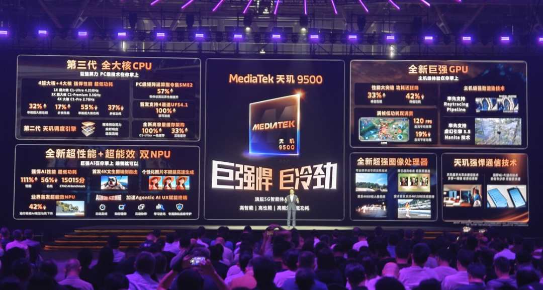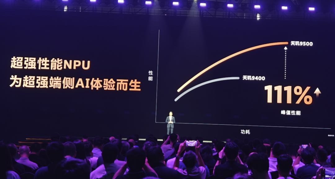 天玑9500的超能效 NPU 则采用了先进的存算一体架构,运行功耗显著降低助力实现AI 模型常驻运行,以更先进的主动式 AI 进一步提升终端用户体验,相较一般的NPU功耗可以降低42%。