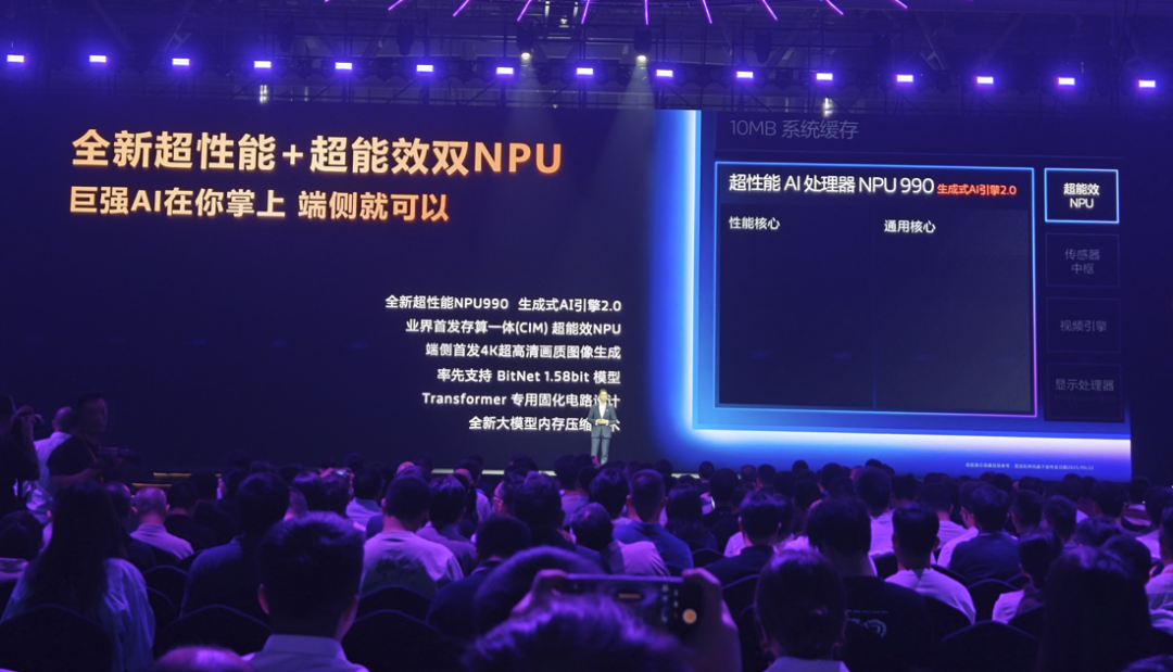 其中,NPU990的超性能NPU为超强端侧 AI 体验而生,峰值性能相较上一代提升 111%,在大语言模型摘要输出能力、多模态理解能力皆有大幅跃进,并率先实现4K高清画质文生图。