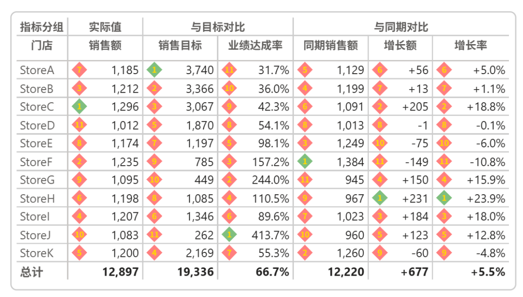这里边的关键是菱形红色背景以及金黄色的字体。支持SVG矢量图的视觉对象都可以使用这个元素增加春节氛围。比如用在表格排名: