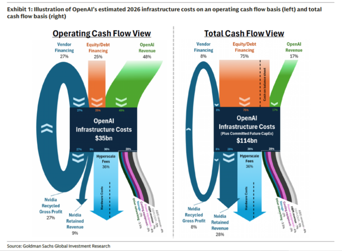 高盛也一份最新的报告中指出,OpenAI在2026年的年度运营基础设施成本(包括推理、训练、人员等)约为350亿美元。在这笔支出中,OpenAI自身收入贡献约48%,供应商融资贡献约27%,外部股权/债务融资贡献约25%。