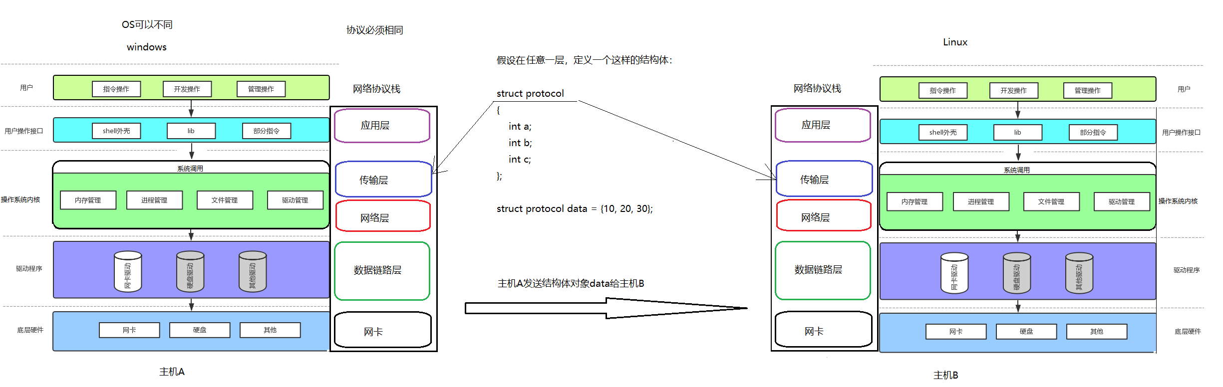 操作系统内核、网络协议栈几乎都是 C/C++ 写的,协议最直观的体现就是:双方用一模一样的结构体。