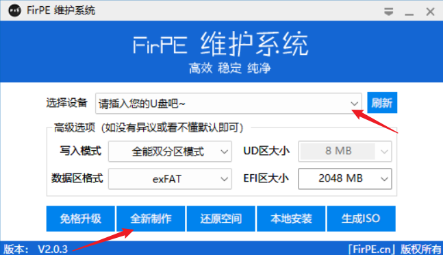 通常可以将WinPE写入U盘,然后U盘插到电脑上,设置从U盘启动,从而进入WinPE。以FirPE为例,下载后运行exe,界面如下,选择U盘,然后点击全新制作,即可完成启动U盘的制作。