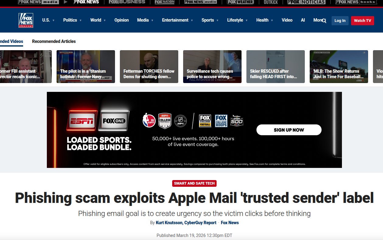 2026年3月,一起针对苹果生态系统的新型钓鱼攻击引起了广泛关注。该攻击并未利用复杂的技术漏洞,而是巧妙地利用了苹果邮件客户端(Apple Mail)的一项便利性功能——“受信任的发件人”(Trusted Sender)标签。在该案例中,受害者收到了一封看似来自苹果官方的紧急通知邮件,声称其iCloud+订阅支付失败,账户面临数据删除风险。极具迷惑性的是,邮件顶部赫然显示着苹果邮件自动生成的蓝色横幅:“此消息来自受信任的发件人”。这一视觉信号极大地削弱了受害者的怀疑心理,导致大量用户在未加核实的情况下点击了恶意链接。