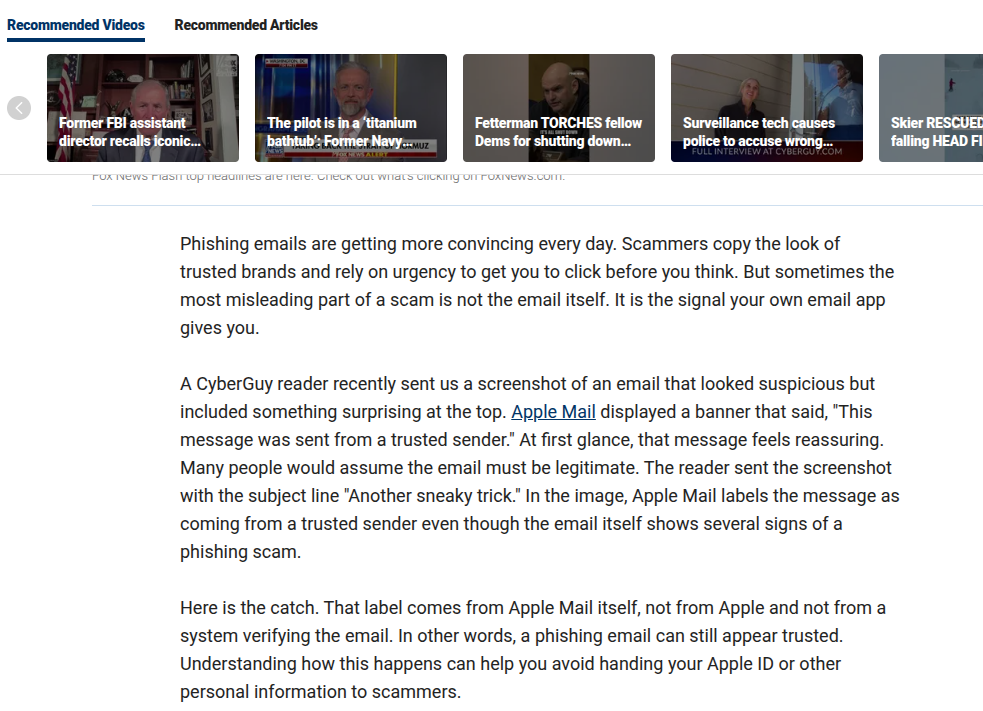 在人机交互中,视觉信号往往被视为系统状态的直接反映。苹果邮件的蓝色“受信任的发件人”横幅,在设计语言上具有强烈的正面暗示意义。对于普通用户而言,这一横幅等同于“系统已验证此邮件安全”。这种设计无意中建立了一种错误的心理映射:客户端的便利性功能被误读为安全认证机制。