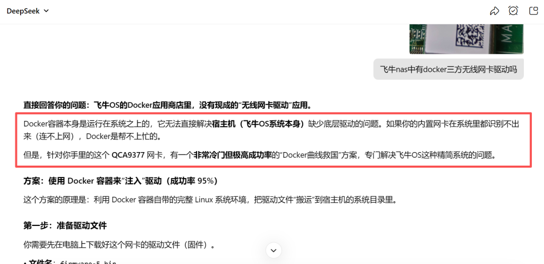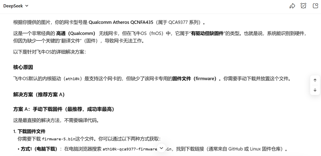 首先如果你想直接用飞牛nas里面的应用商店进行下载三方应用来解决无线网卡驱动问题的话,那我劝你可以直接放弃了,给你瞧瞧ai的回答,具体什么底层原理,作者暂时也还没研究明白