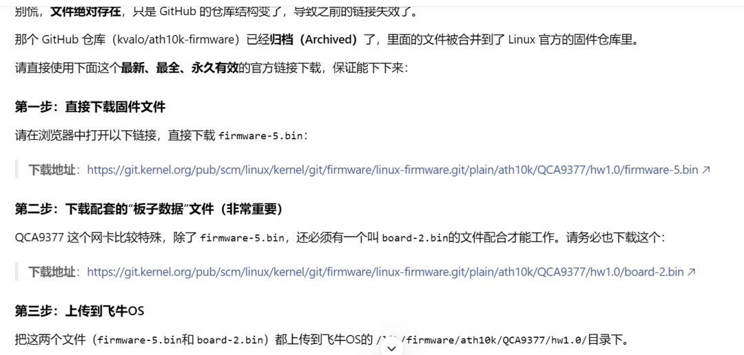 sudo wget -O firmware-5.bin https://github.com/kvalo/ath10k-firmware/raw/master/QCA9377/hw1.0/firmware-5.bin如果执行第三步的时候,出现报错或者提示这个这个资源不存在,别慌,我们可以进行手动下载下来,然后复制到创建的那个目录里面。