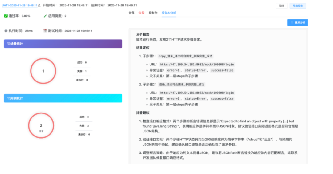 ● 在“分析”环节:当测试失败时,AI能智能分析海量的日志和响应数据,快速定位问题根源,并提供修复建议,将测试人员从“盲目排查”中拯救出来,实现从“发现问题”到“定位问题”的质变。